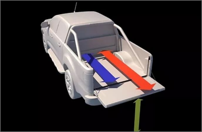 1.テールゲートを閉じて状態での貨物エリアの長さ(上のピックアップの青い線)